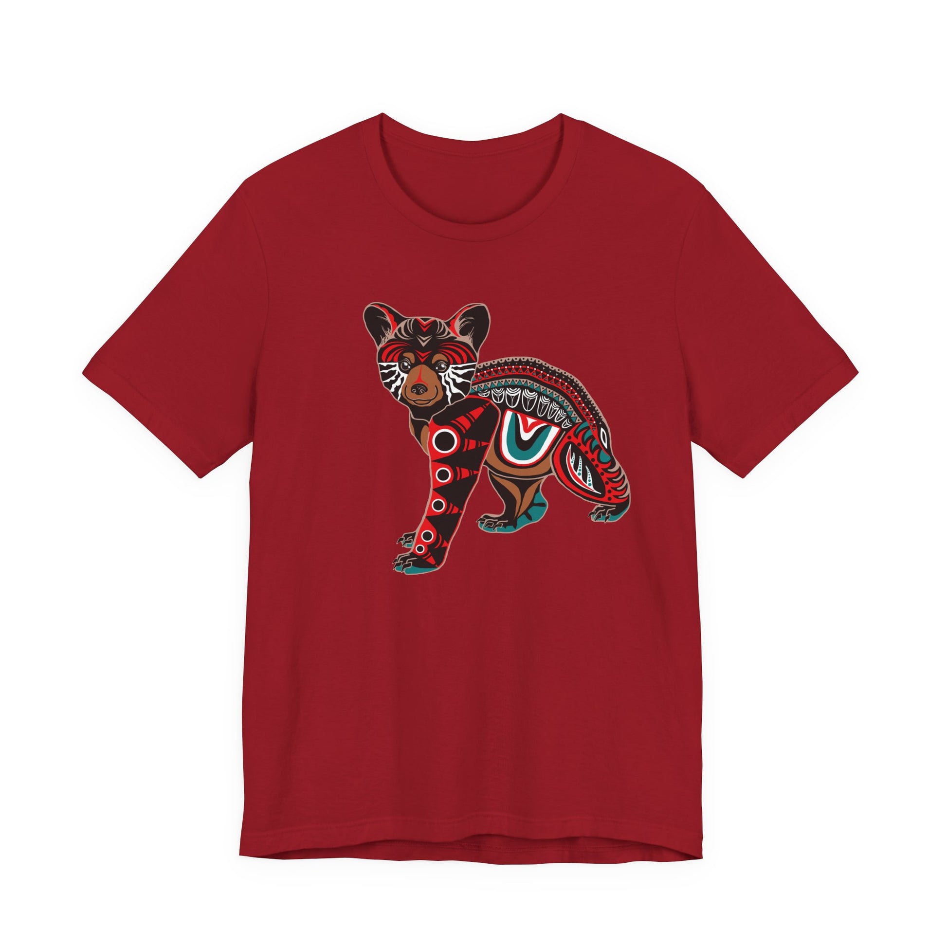 Celebrate the playful spirit and quiet strength of the wild with the Black Bear Cub T-Shirt! This patterned shirt features a striking Alaska Native-inspired design, with a curious black bear cub bringing the essence of the Alaskan wilderness to life. The design, reminiscent of cozy holiday sweaters but with distinct Alaska-themed patterns, evokes the charm and resilience of the bear cub, a symbol of growth, curiosity, and the protective instincts of nature.