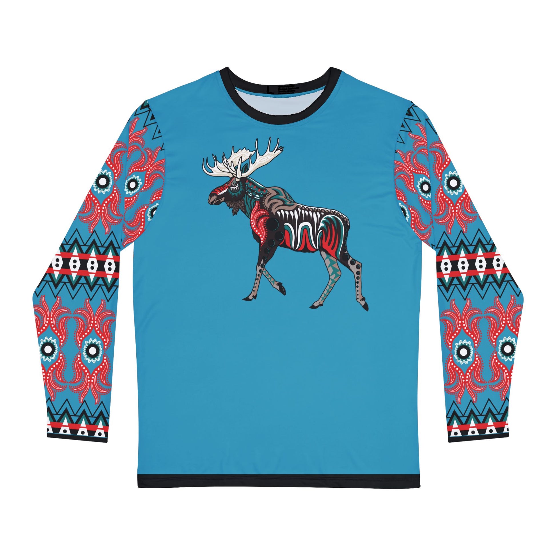 Stand tall and proud in this striking blue long-sleeve, featuring a captivating Alaska Native-inspired moose design on the front. The intricate patterns on the sleeves echo the majestic lines of the moose, creating a bold and harmonious look. Known for their calm strength, confidence, and quiet dignity, moose are symbols of endurance and individuality, thriving in the rugged wilderness of Alaska.