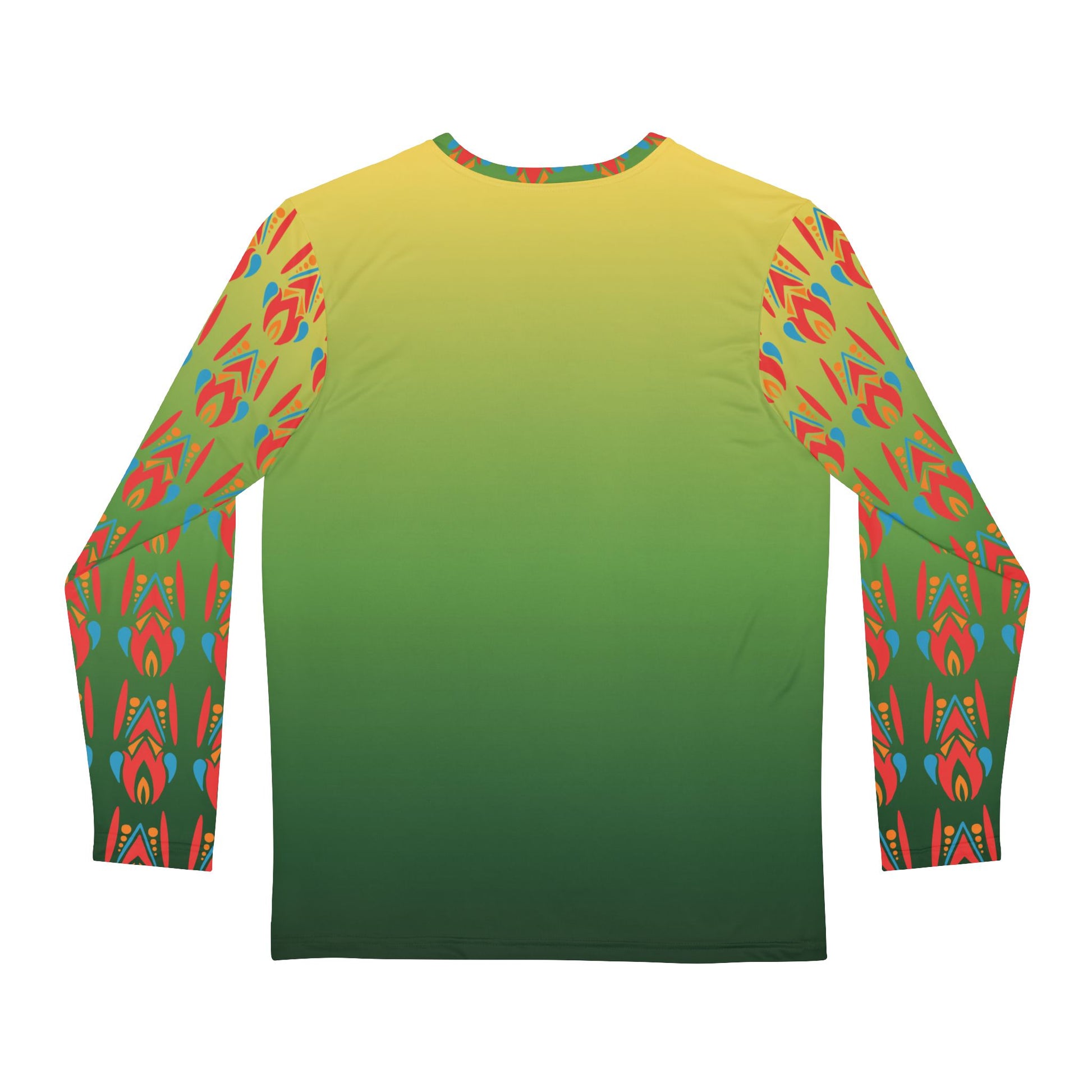 Let your spirit soar with the Forest Watcher - Eagle Long-Sleeve! The eagle is watchful, wise, and deeply connected to the land. Set against a rich green gradient backdrop, this design reflects the harmony between earth and sky. The bold sleeve motifs honor unity and connection across generations.