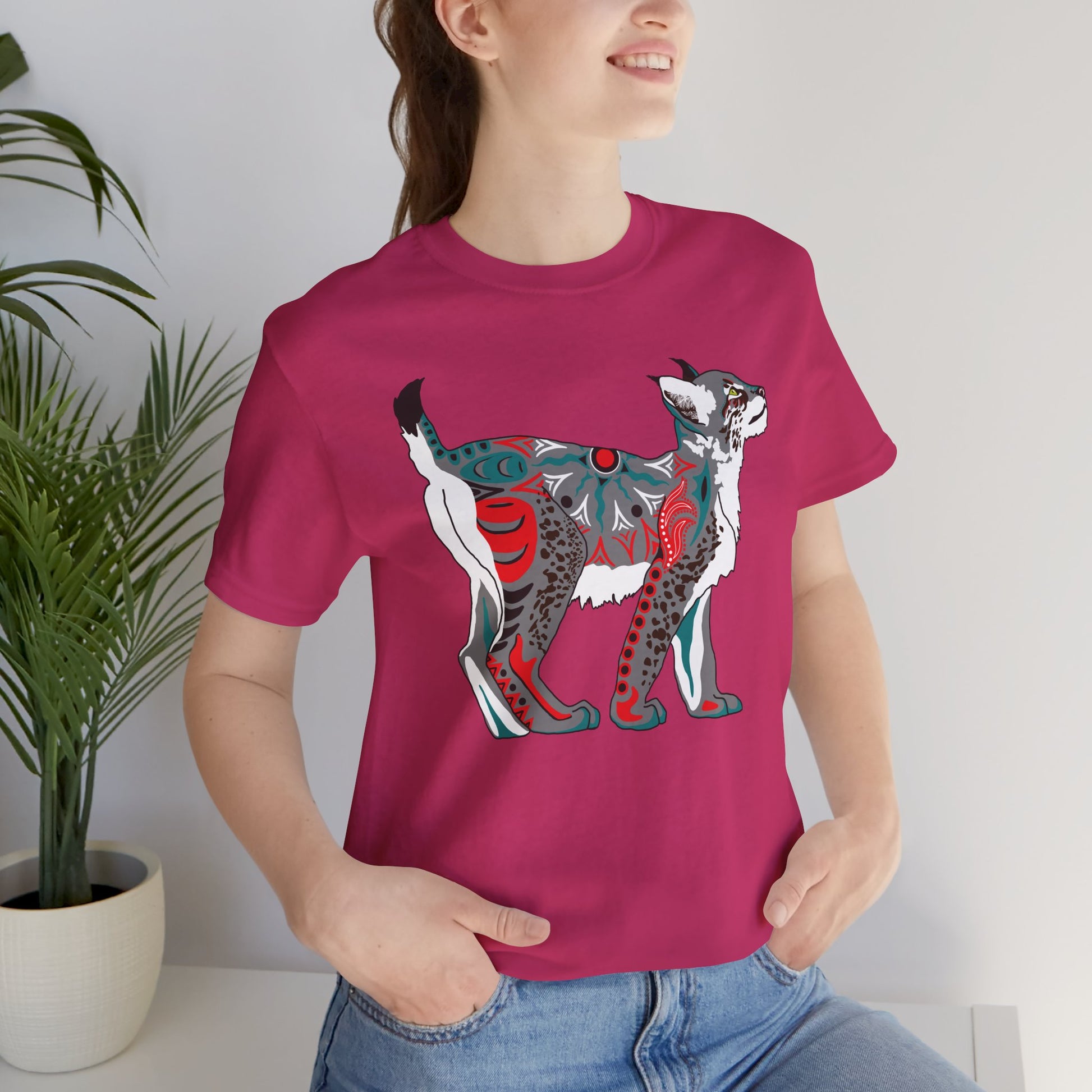 Embody the quiet strength and curiosity of the wild with this short-sleeve t-shirt, featuring an Alaska Native-inspired lynx kitten design on the front. The lynx kitten is known for its playful yet cautious nature, embodying sharp instincts and adaptability as it moves through the Alaskan wilderness. With its keen sense of awareness and graceful agility, the lynx symbolizes the balance between curiosity and wisdom, a reminder to approach life with both confidence and careful observation.