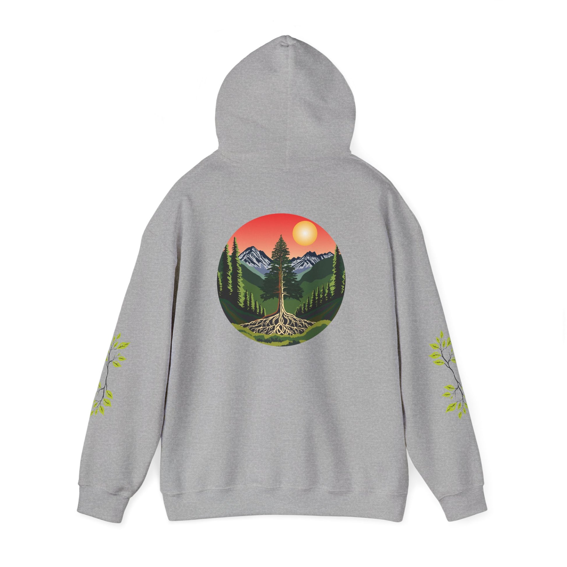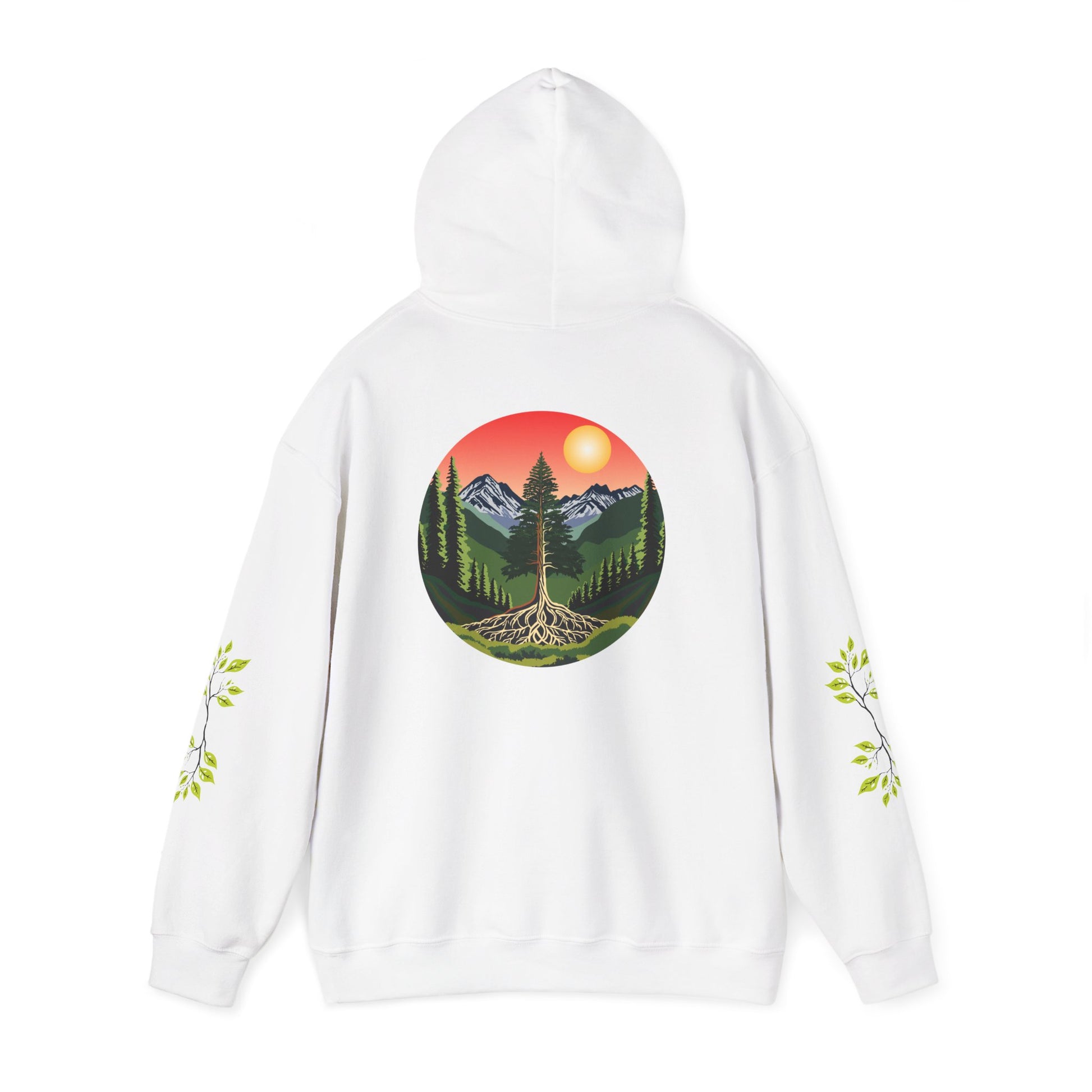 The sleeves are adorned with bright leaves, echoing new growth for the future. The back reveals a powerful landscape—an evergreen tree rooted deep beneath the mountains and sun—symbolizing the endurance of identity across time and place.