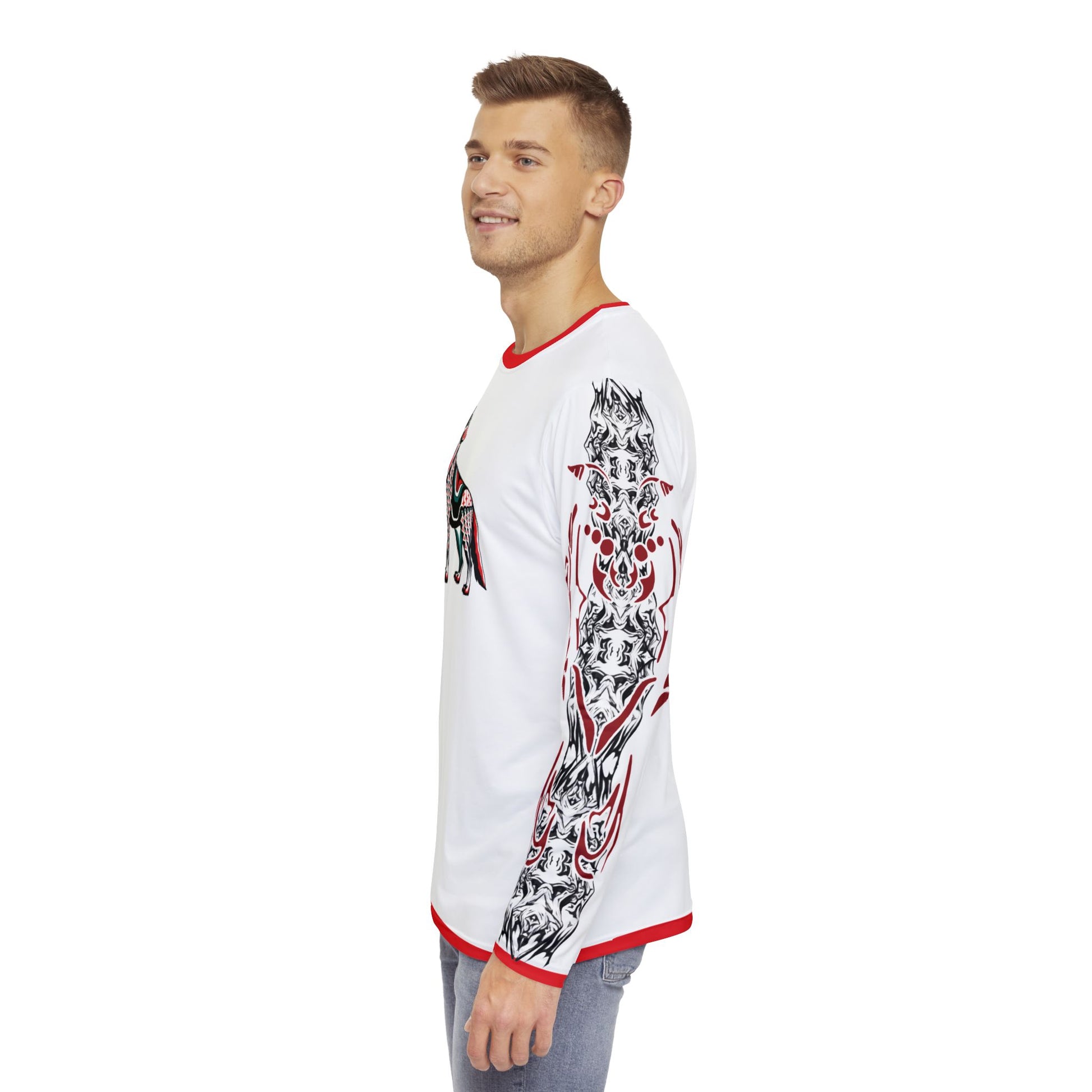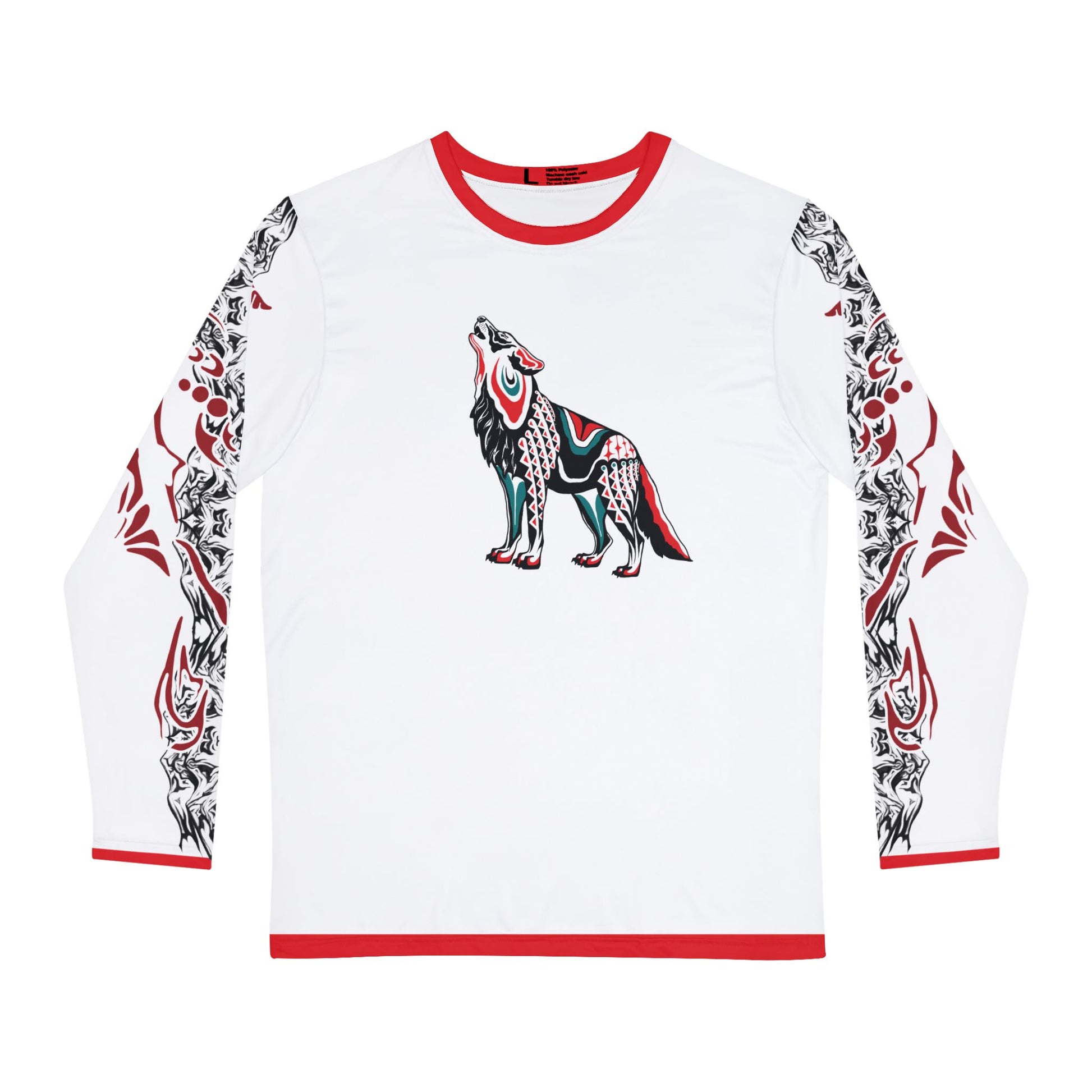 Channel the call of the wild with this crisp white long-sleeve featuring a stunning Alaska Native-inspired howling wolf design on the front. The intricate patterns on the sleeves enhance the design of the wolf, creating a cohesive and dynamic look that honors this revered creature. The wolf symbolizes loyalty, intelligence, and a deep connection to community, while its howl represents freedom, communication, and the strength of unity.