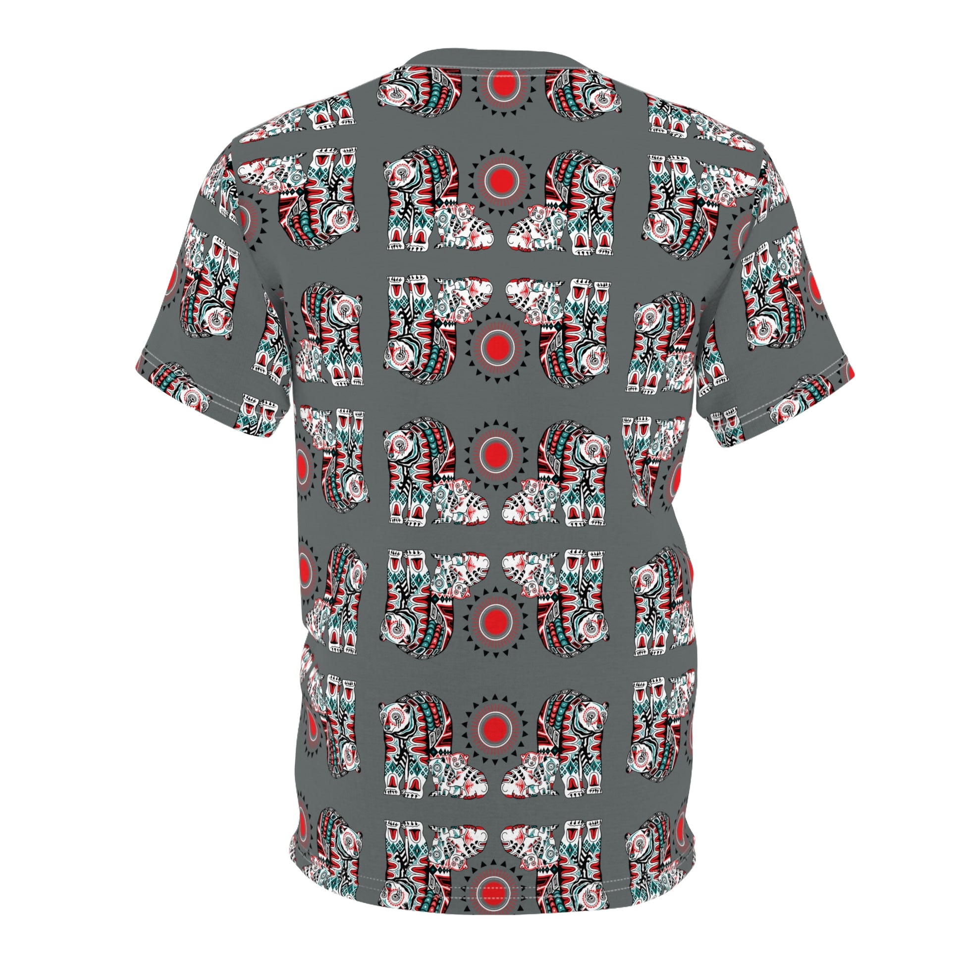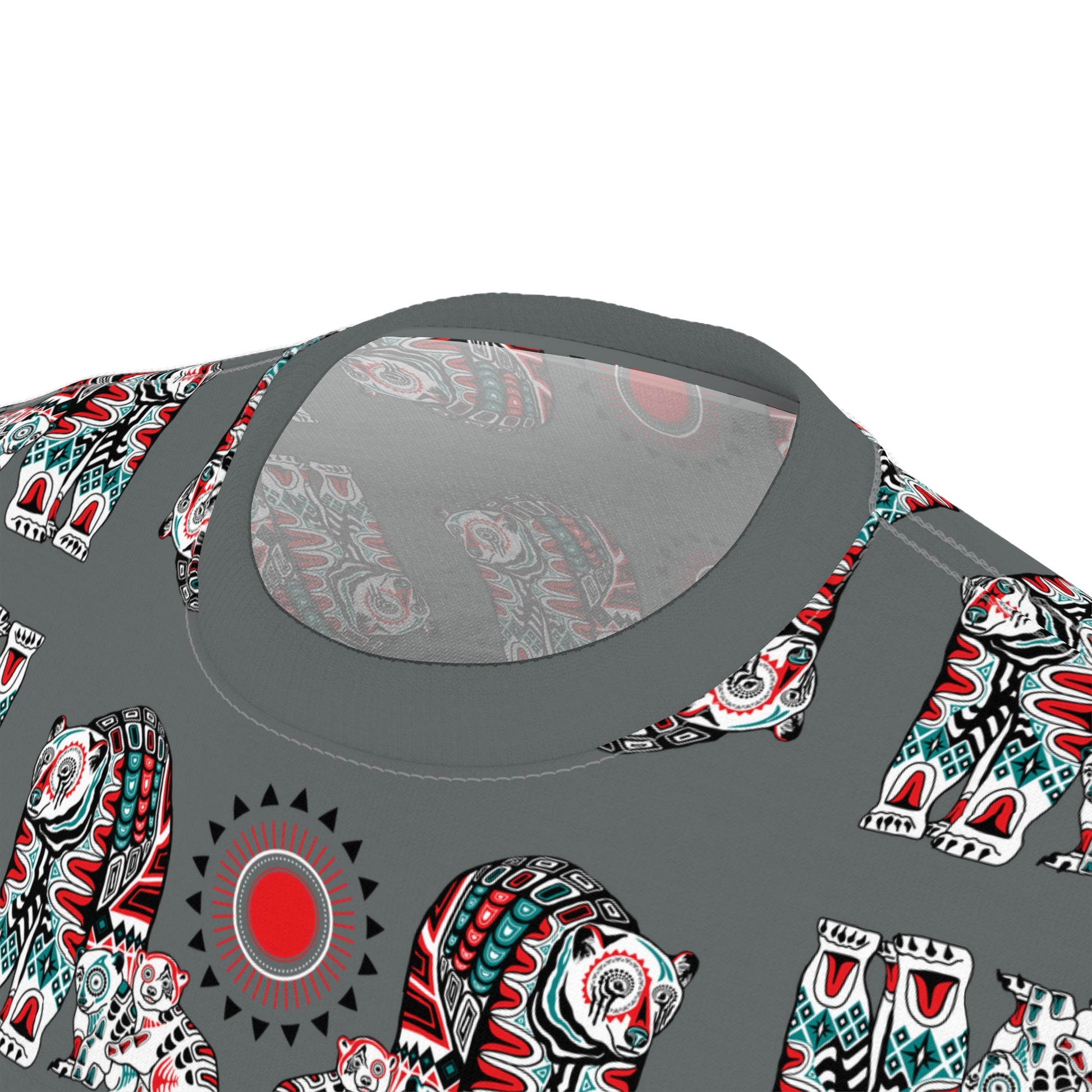 Wrap yourself in the spirit of the Arctic with the Polar Bear Wallpaper T-Shirt. This light gray short-sleeve tee showcases a stunning patterned polar bear design inspired by Alaska's majestic Nanook (polar bear). The intricate design blends modern artistry with traditional influences, capturing the resilience and strength of this iconic creature. Made from soft, breathable fabric, this t-shirt is perfect for adventurers and wildlife enthusiasts alike.