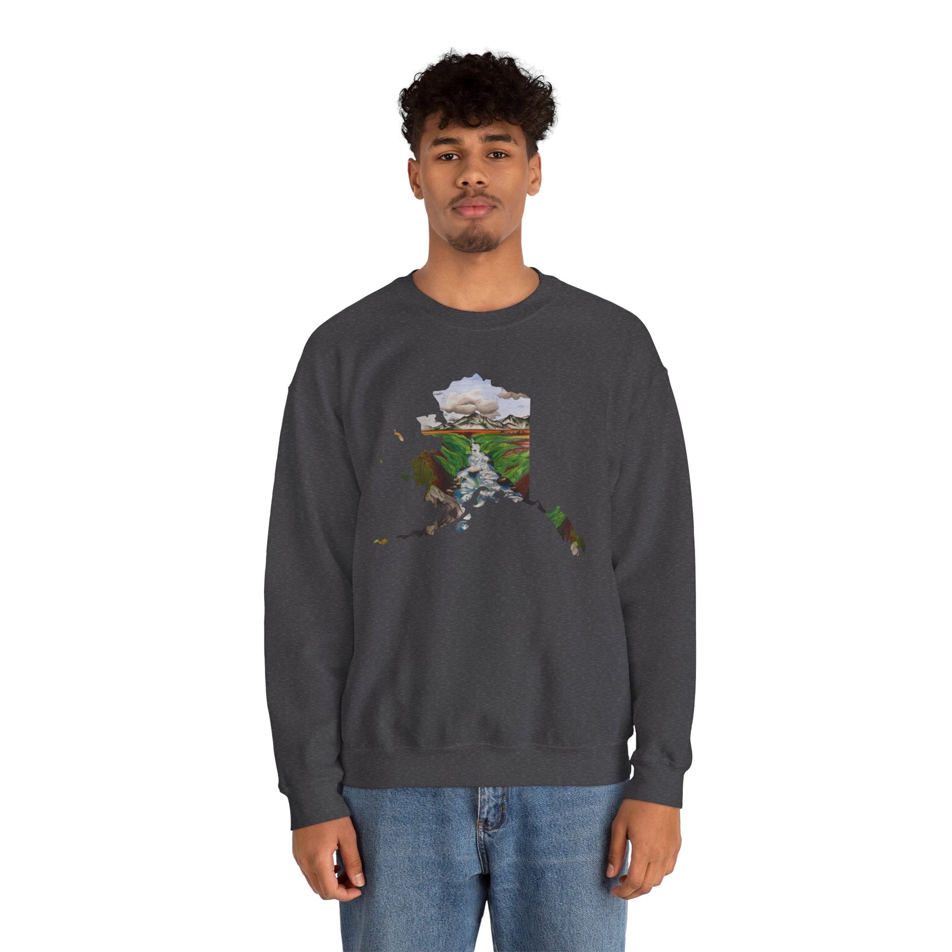 Presented in a bold, modern style, the artwork forms the shape of Alaska, making it a powerful statement of identity and appreciation for the land's natural splendor. Made with high-quality, cozy fabric, this crewneck offers both comfort and style, perfect for everyday wear or special occasions. Wear it proudly.