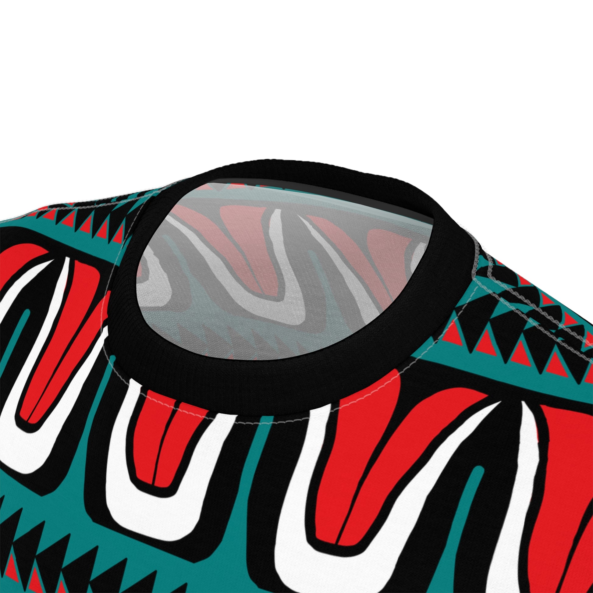 Make a bold statement with the Southeast Silhouette Horizontal Pattern T-Shirt, a wearable piece of art inspired by the rich traditions of Tlingit design. Featuring striking U-shape patterns in classic Tlingit colors—red, white, black, and teal—this all-over print (AOP) shirt combines heritage with a contemporary twist.