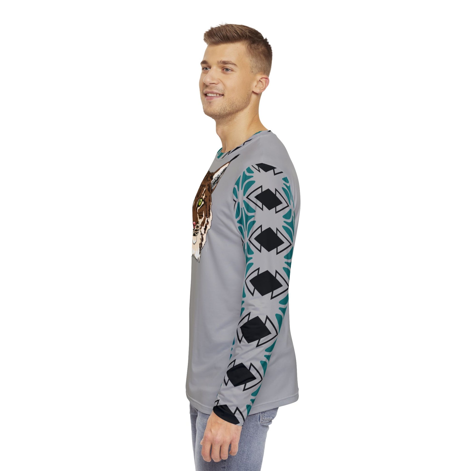tep into the wild with the Tan Lynx Face Long-Sleeve, a gray long-sleeve t-shirt featuring the striking front-facing portrait of a lynx face. The intricate patterns along the sleeves add a touch of artistry inspired by Alaskan Native designs, making it more than just a shirt—it's a statement. Soft, durable, and perfect for cooler days, this long-sleeve combines comfort and bold design, embodying the grace and mystery of one of Alaska’s most elusive creatures.