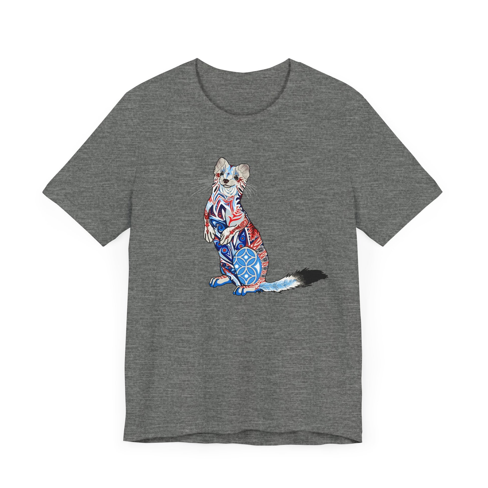 This design pays tribute to the elusive ermine in its stunning seasonal coat—brilliant white, blending seamlessly into the snow-laced wilds of Alaska. Poised against a glacier-blue backdrop, the ermine wears intricate tribal markings in deep reds and icy blues, symbols of transformation and survival.